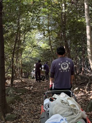 神奈備である現場、道中磐座などもあり失礼の無いよう心掛け、御用材の重量や形状など多岐に渡りますが自然を壊さぬようアプローチ(仮設)を組み、運搬車を使いながら安全に作業しています。